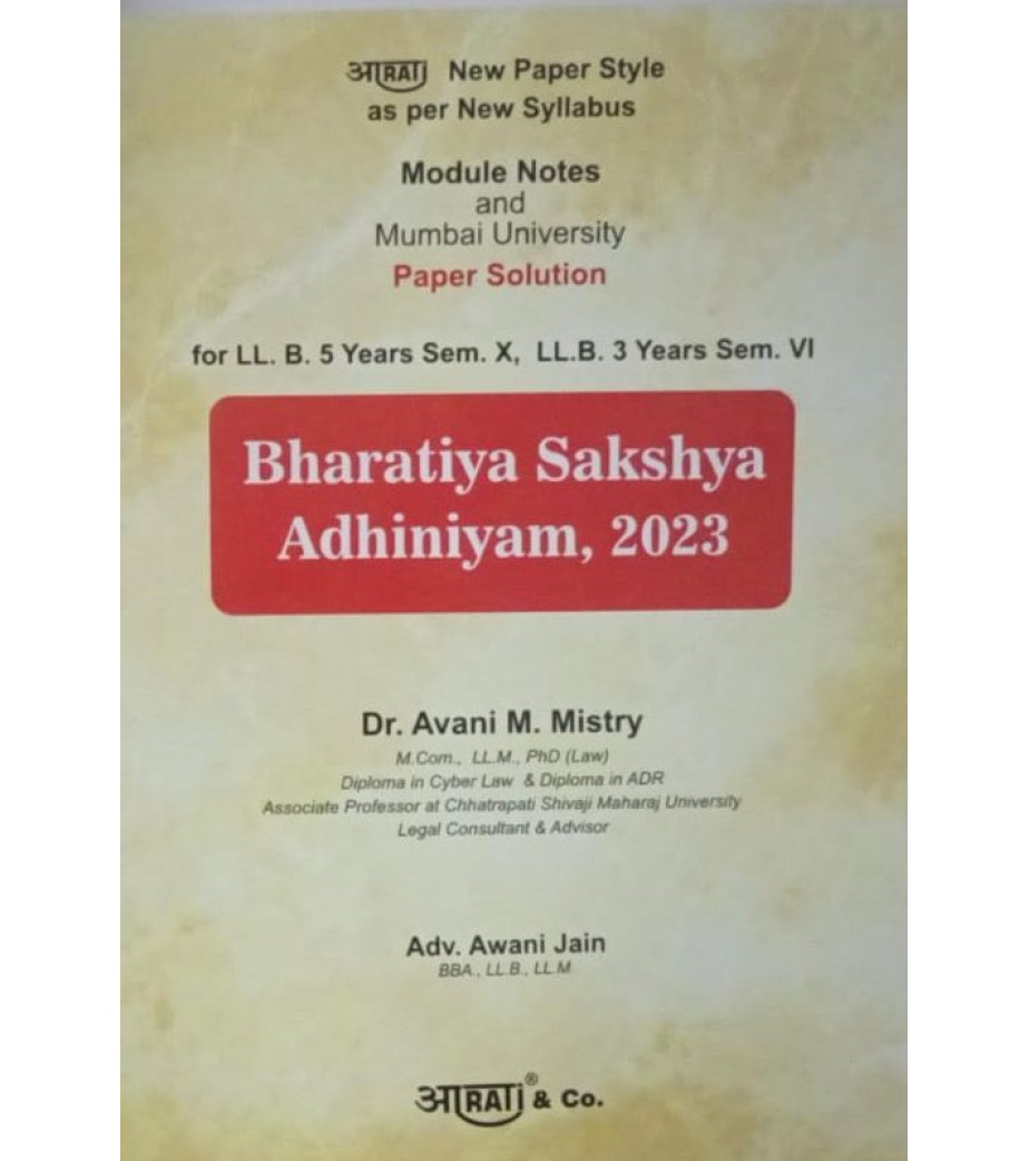 Comprehensive module notes on Bharatiya Sakshya Adhiniyam, 2023 Resolved examination solutions for LLB 5 Years (SEM X) and LLB 3 Years (SEM VI) Explores essential legal principles, provisions, and interpretations Organized responses with a focus on examination strategies An essential resource for law students at Mumbai University.
